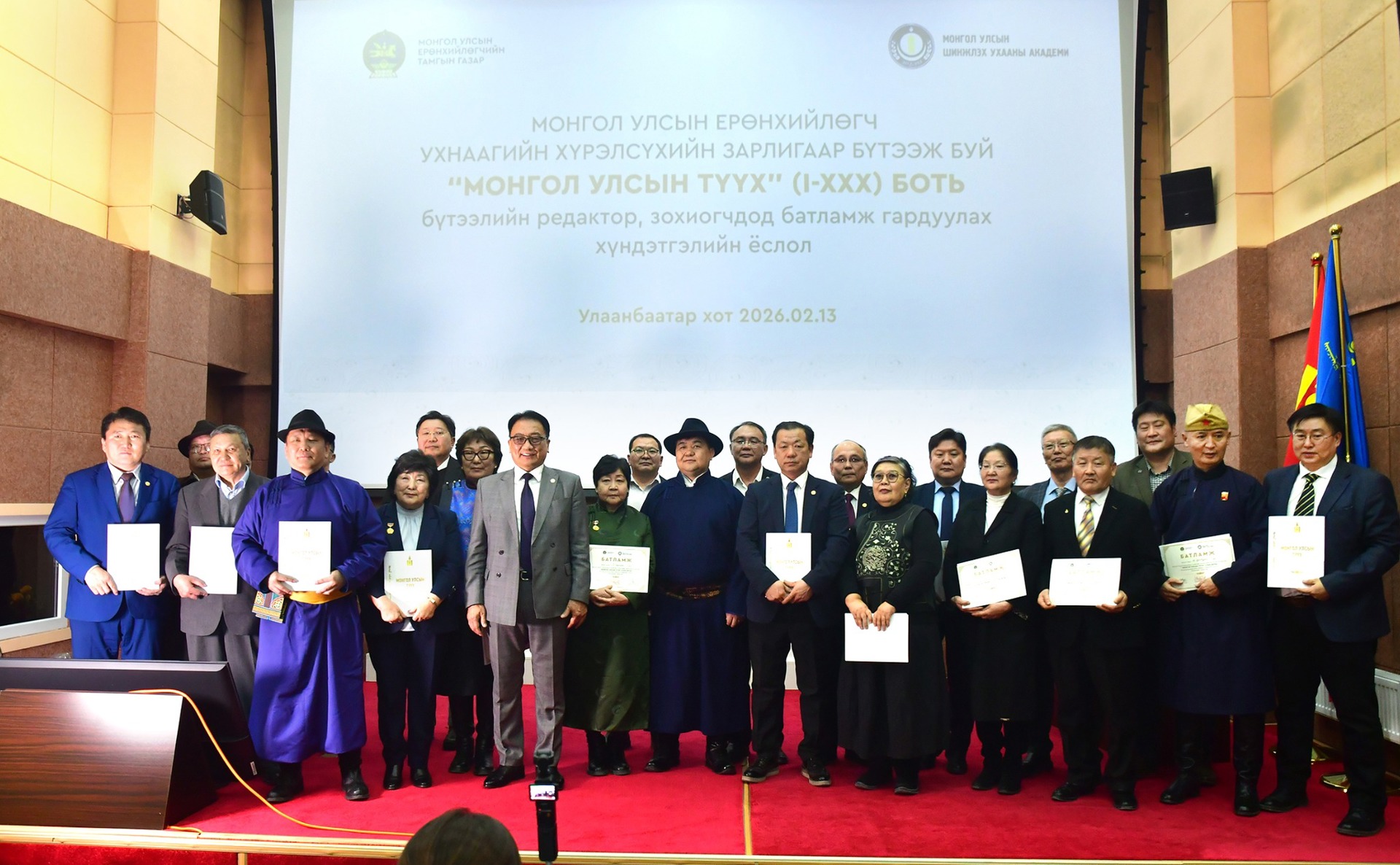 Өнөөдөр “Монгол Улсын түүх" (30 боть) бүтээлийн редактор, зохиогчоор сонгогдсон эрдэмтэн судлаачдад батламж гардуулах ёслол Монгол Улсын ШУА-ийн Тэргүүлэгчдийн газрын Хурлын танхимд боллоо. “Монгол Улсын түүх” бүтээл нь Монголын нэн эртний түүхээс өнөөг хүртэлх цаг хугацааг хамрах бөгөөд Монголын эртний түүхээс Их Эзэнт улс хүртэл 10 боть, Эзэнт улс болон түүний дараах 17 зууны хаадын үе хүртэлх 10 боть, Чин улсын эрхшээлээс өнөөг хүртэл 10 боть бичигдэхээр төлөвлөн бичиж байна.