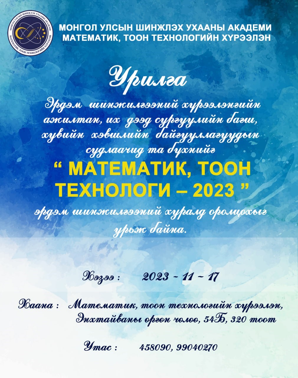 "МАТЕМАТИК, ТООН ТЕХНОЛОГИ-2023" ЭРДЭМ ШИНЖИЛГЭЭНИЙ ХУРАЛ БОЛНО (ХУРЛЫН ХӨТӨЛБӨР)