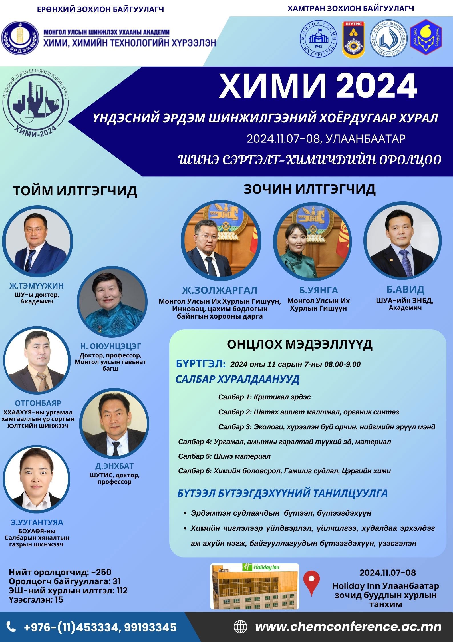 Та бүхнийг "ХИМИ 2024" үндэсний 2 дугаар эрдэм шинжилгээний хуралд хүрэлцэн ирэхийг урьж байна. Дэлгэрэнгүй мэдээллийг http://chemconference.ac.mn/ ээс авна уу.