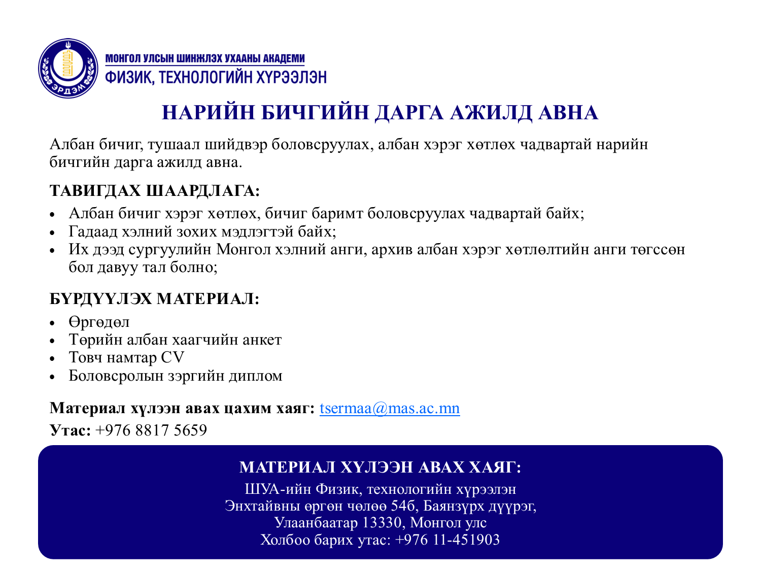 ЭРДЭМ ШИНЖИЛГЭЭНИЙ АЖИЛТАН СОНГОН ШАЛГАРУУЛЖ АВНА