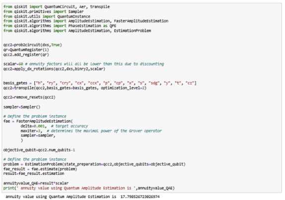Энэ арга нь цөөн тооны даатгуулагчтай тохиолдолд үр дүнтэй ажилдаг. Үр дүнг сайжруулахын тулд загвар авах давтамжийг нэмэгдүүлэх нь хэдэн зуун мянган даатгуулагч бүхий бодит багцтай үед практик бус бөгөөд их хэмжээний нөөц, бололцоо шаардана. Үүний оронд бид квант далайцын үнэлгээ (QAE)-г ашиглаж болно. QAE нь “хэмжилтийн кубит” |1⟩ төлөвт байх магадлалыг үнэлэх зориулалттай квант алгоритм юм. QAE нь квадрат хурдатгалыг ашигладаг бөгөөд үнэлгээний тодорхойгүй байдал нь уламжлалт Монте Карлогийн 1/√N-тай харьцуулахад 1/N-тэй пропорциональ байдаг.