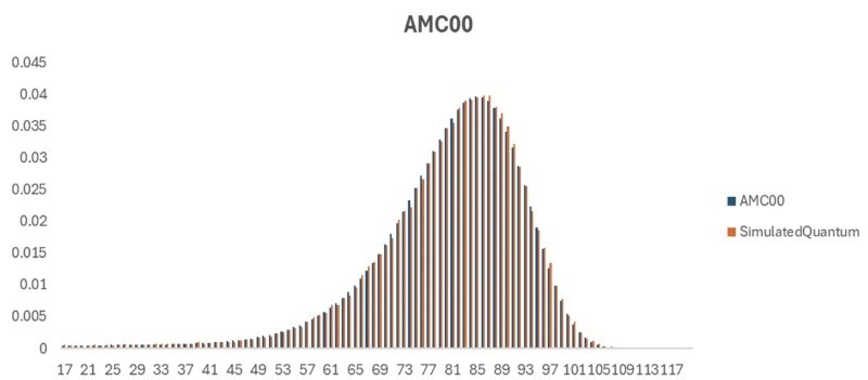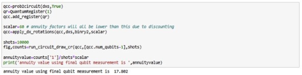 Зураг 9-д Qiskit (Python)-ийг ашиглан 60 настай хүний хувьд, мөн тогтмол 2% хүүтэй тохиолдолд үр дүнг харуулсан. 60-аас 120 насны хүмүүсийн хувьд амьд үлдэх магадлалуудыг кодлоход ердөө зургаан кубит хэрэгтэй бөгөөд долоо дахь кубит нь хяналттай хувиргалтууд болон хэмжилтэд зориулагдана. Тэтгэврийн төлбөр нь жил бүр урьдчилан төлөгддөг гэж үзвэл, онолын хувьд зөв утга нь 17.735 байна. Бидний квант үр дүн үүнд нэлээд ойртсон. Гэхдээ квант процессын магадлалын шинж чанараас шалтгаалан схемийг ажиллуулах бүрт бага зэрэг хэлбэлзэл ажиглагддаг. Классик, хуурамч санамсаргүй үүсгэгчүүдээс ялгаатай нь, квант санамсаргүй үзэгдлийг програмчлах боломжгүй тул ийм зөрүү гардаг. Үр дүнгийн нарийвчлалыг сайжруулахын тулд, схемээс загвар авах давталтын тоог нэмэгдүүлэх боломжтой.