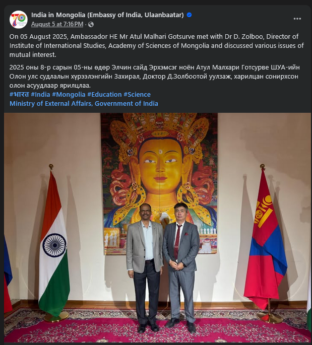 On 05 August 2025, Ambassador HE Mr Atul Malhari Gotsurve met with Dr D. Zolboo, Director of Institute of International Studies, Academy of Sciences of Mongolia and discussed various issues of mutual interest.