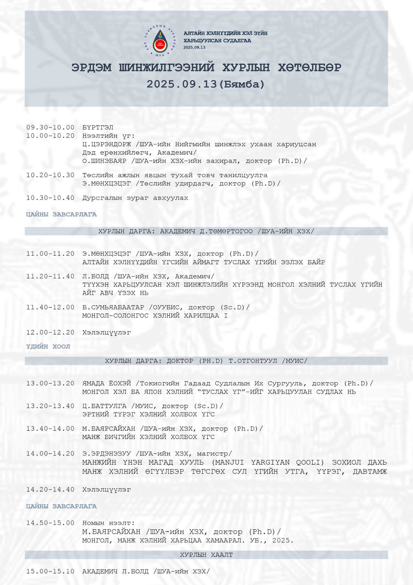 “АЛТАЙН ХЭЛНҮҮДИЙН ХЭЛ ЗҮЙН ХАРЬЦУУЛСАН СУДАЛГАА” Эрдэм шинжилгээний хурлыг амжилттай зохион байгууллаа. Тус хурал нь ШУА-ийн Хэл зохиолын хүрээлэн дээр хэрэгжиж буй «Алтайн хэлнүүдийн хэл зүйн харьцуулсан судалгаа (Туслах үгийн аймгийн жишээгээр)» суурь судалгааны төслийн хүрээнд зохион байгуулагдав.