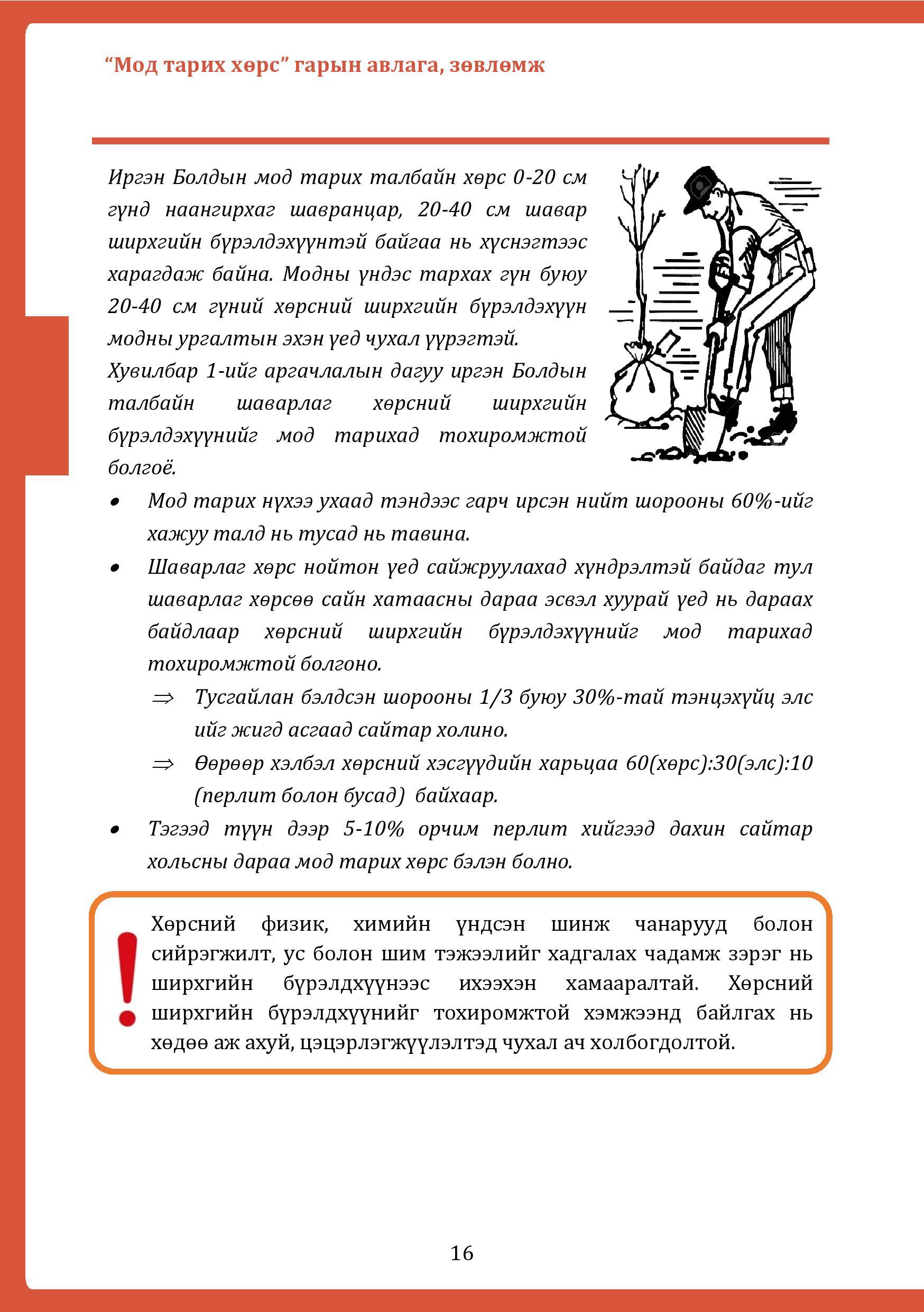Хөрсний шинж чанарын хувьд органикийн агууламж бага, шим тэжээлийн макро элементийн хангамж сул, карбонат их, хялбар уусах давсны агууламж өндөр, ширхгийн бүрэлдэхүүний хувьд хэт хүнд, хөнгөн байх нь нийтлэг асуудал бөгөөд энэхүү зөвлөмж, хялбаршуулсан гарын авлагад мод, ургамал тарихад тохиромжгүй хөрсний шинж чанарын сайжруулалтыг хялбараар хэрхэн хийх боломжийн талаар хэд хэдэн хувилбараар боловсруулан орууллаа.