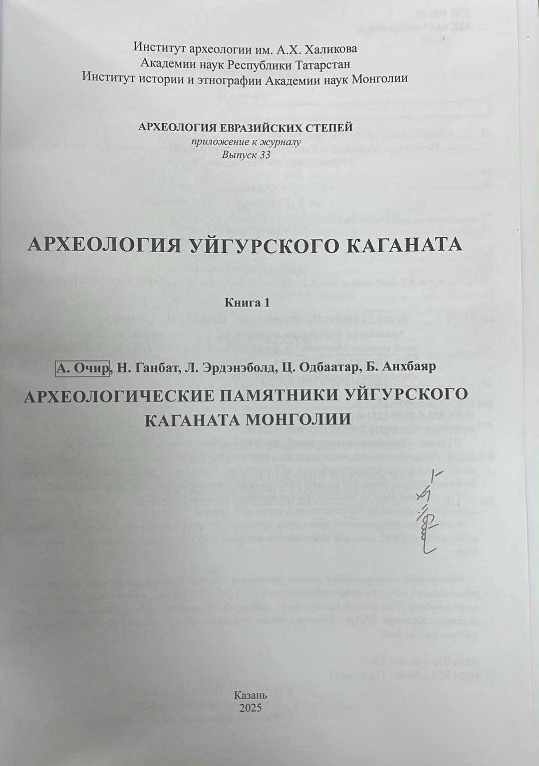 ШУА-ийн Түүх, угсаатны зүйн хүрээлэнгийн зөвлөх профессор А.Очир агсан, тус хүрээлэнгийн захирал доктор Л.Эрдэнэболд болон доктор Б.Анхбаяр, Ц.Одбаатар нарын хамтран туурвисан “Монгол нутаг дахь Уйгурчуудын археологийн дурсгал” /УБ., 2019/ бүтээл Орос хэл дээр орчуулагдан гарлаа. ОХУ-ын Татарстаны БНУ-ын Шинжлэх ухааны академийн А.Х.Халиковын нэрэмжит Археологийн хүрээлэнгээс эрхлэн гаргадаг “Евроазийн тал нутгийн археологи” сэтгүүлийн 33-р дугаар, “Уйгурын хаант улсын археологи” цувралаар “Археологические памятники Уйгурского каганата Монголии” /Кн.1, Ред, А.Г.Сидтиков, Изд-во АН РТ, Казань 2025/ нэрээр хэвлэгдэн гарч оросын түүхчид, археологчид, мянга мянган уншигчид, сонирхон судлагчдын гар дээр очлоо. Номын зохиогчиддоо болон номыг бүтээхэд оролцсон бүх хүмүүст баяр хүргэе.