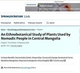 ШУА-ийн Газарзүй, геоэкологийн хүрээлэнгийн Газарзүйн мэдээллийн систем, зурагзүйн салбарын эрдэм шинжилгээний тэргүүлэх ажилтан доктор М.Уртнасан, эрдэм шинжилгээний дэд ажилтан А.Золзаяа, Ц.Наранцацрал, М.Нямхүү, В.Баярмаа нарын хамтран бичсэн “An Ethnobotanical Study of Plants Used by Nomadic People in Central Mongolia” эрдэм шинжилгээний бүтээл олон улсын нэр хүндтэй Springer хэвлэлийн “Ethnobiology and Development in Asia” номын бүлэгт хэвлэгдэн гарлаа.