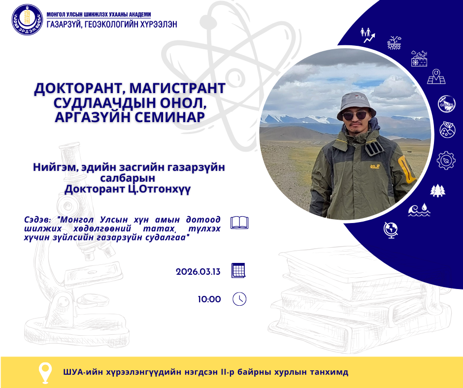ШУА-ийн Газарзүй, геоэкологийн хүрээлэнгээс 2024 оны 1-р сараас эхлэн цувралаар зохион байгуулж буй докторант, магистрант судлаачдын судалгааны ажлаа танилцуулах онол, аргазүйн 2026 оны IV семинар 2026 оны 03-р сарын 13-ны өдрийн 10 цагт хүрээлэнгийн 1-р байрны хурлын зааланд болно.